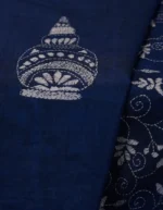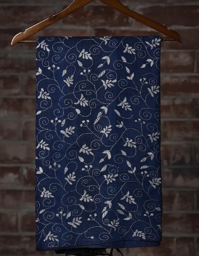 ovingly crafted over two months by women artisans in Kirnahar village, Bolpur—the heart of Kantha embroidery—this masterpiece showcases intricate Reverse Kantha work. Delicate white floral motifs bloom across a richly textured field of fine stitches, each telling a story of patience and heritage.